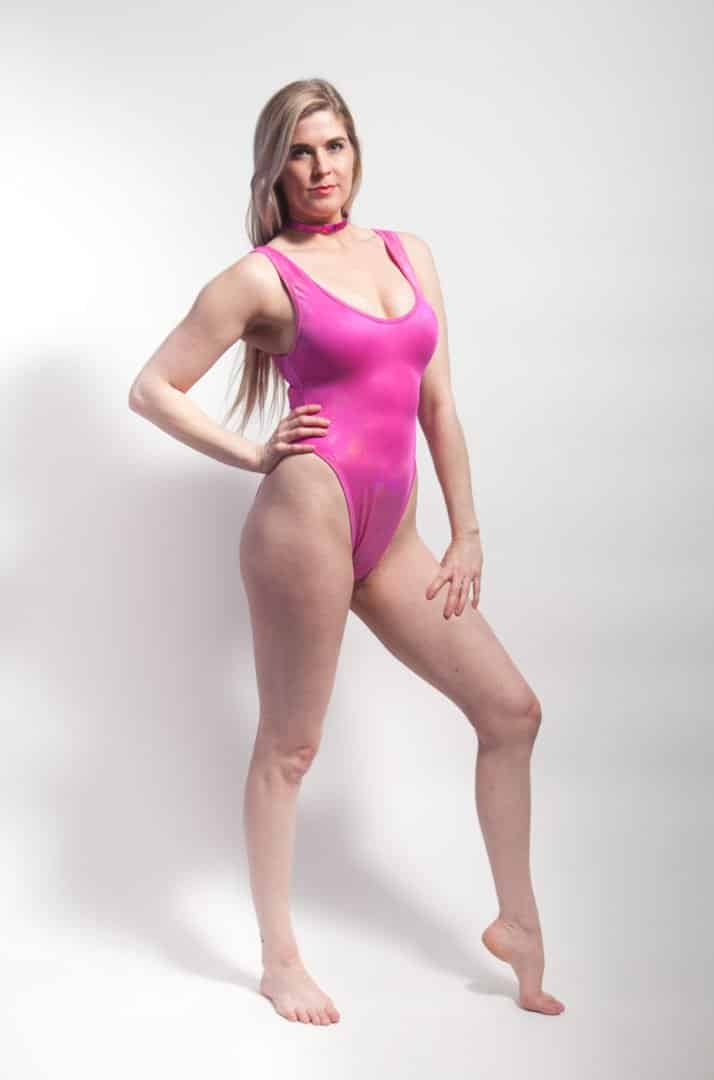 The last photo of this set where Monroe wears a pink swimsuit is quite sexy.